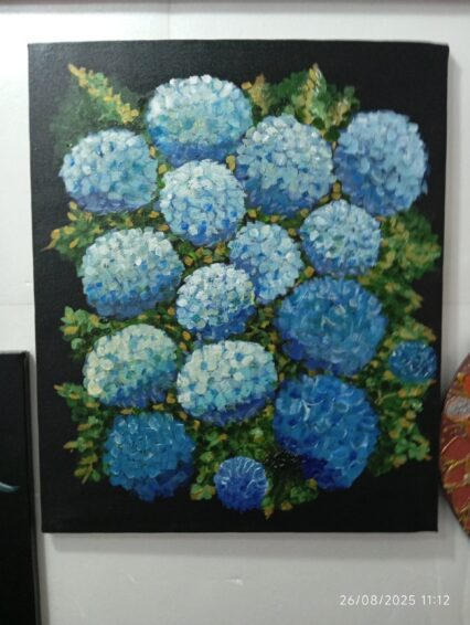 Dipinto olio su tela che rappresenta dei fiori blu.
